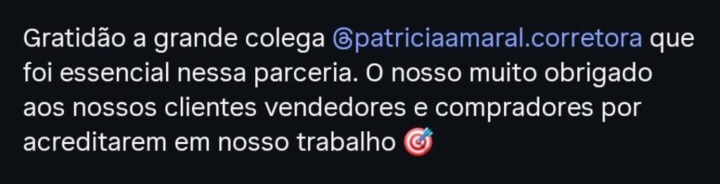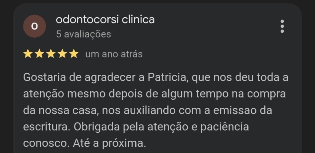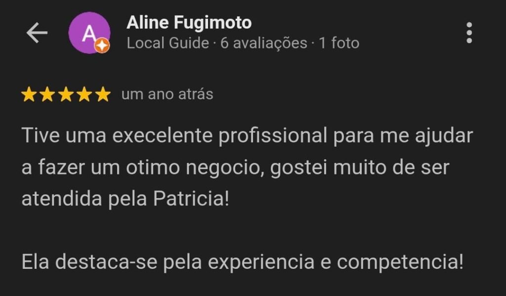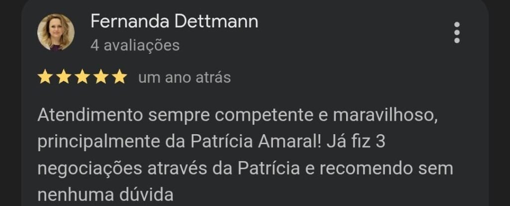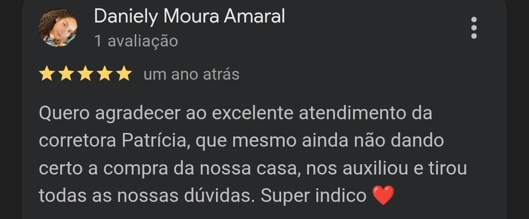 A Patrícia não vende apenas imóveis ela cuida de pessoas. Foi atenciosa em cada etapa, explicou tudo com clareza, teve paciência com minhas dúvidas e esteve presente do início ao fim do processo. Em momentos de insegurança, foi firme. Em momentos de ansiedade, foi acolhedora. E quando peguei as chaves na mão, tive certeza: fiz a melhor escolha.